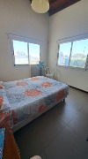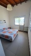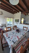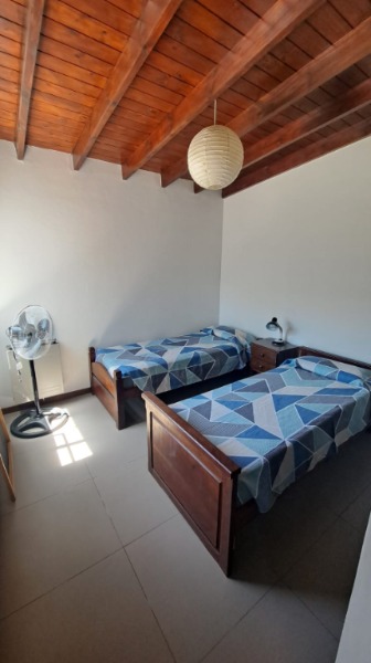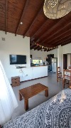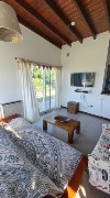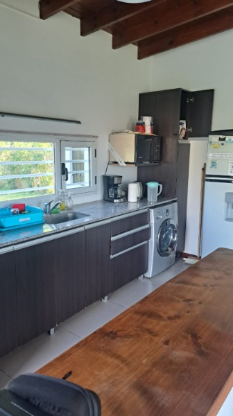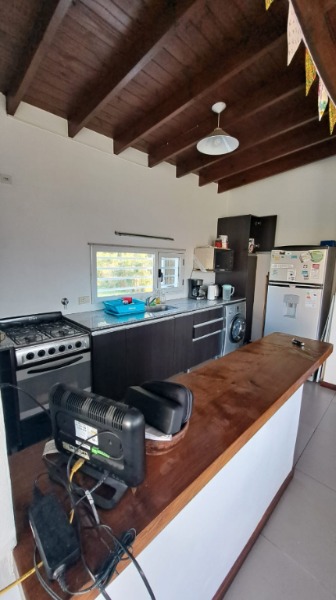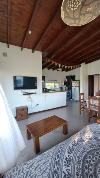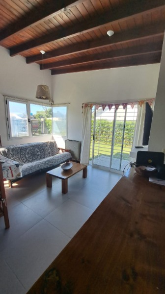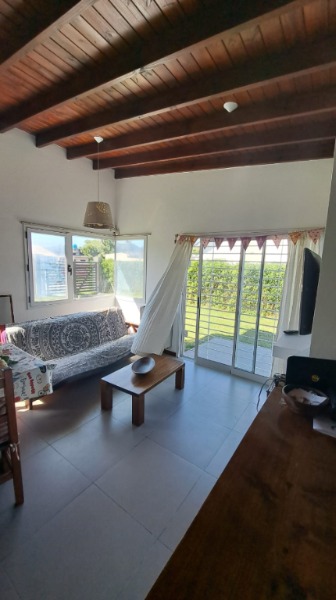 La casa cuenta con una superficie cubierta de 63 m² y una distribución funcional: dispone de dos dormitorios, un cómodo living con cocina integrada y muy buena entrada de luz natural. Los ambientes se destacan por sus techos de madera a la vista, que aportan calidez y estilo.