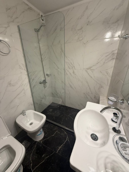Baño principal renovado, con mampara corrediza de vidrio templado.
