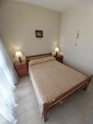 Dormitorio principal con cama matrimonial, placard y ventana al exterior con cortinas.