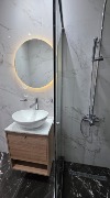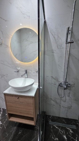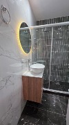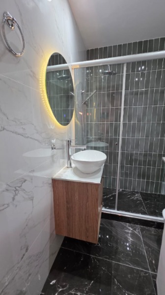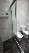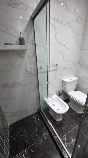 Baño principal renovado, con mampara corrediza de vidrio templado.