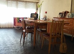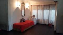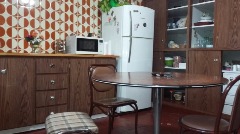 Amplia cocina comedor de 3,5 x 4 m con gran ventana al parque y revestida en cerámico; equipada con mesadas de mármol y de madera, bajo mesadas, placard empotrado, cocina y termotanque. Baño completo revestido en cerámicos para modernizar.